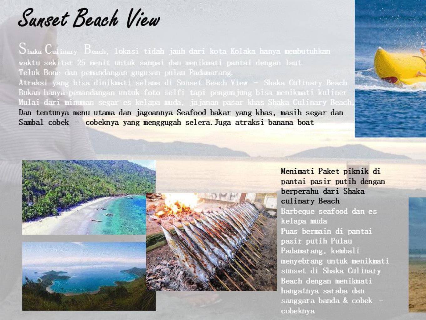 Adapun paket tour Sunset Beach View ini diawali kegiatannya dari shaka culinary beach untuk menyebrang menuju pulau padamarang, ada dua atraksi yang bisa dilakukan di Padamarang pertama bisa hiking dan yang kedua diving atau snorkling, dan kedua atraksi itu bisa juga dilakukan sekaligus. hanya disarankan untuk bisa menikmati kegiatan 2 atraksi tersebut harus mulai menyebrang dini hari supaya paket kegiatannya bisa dinikmati semua. Dalam paket ini sudah tersedia perahu, perlengkapan diving ataupun snorkling, persiapan untuk makan siang dan persiapan selama hiking. Segala sesuatu yang terkait kegiatannya bisa didiskusikan  detail  dengan pengelola desa wisata Sani - Sani