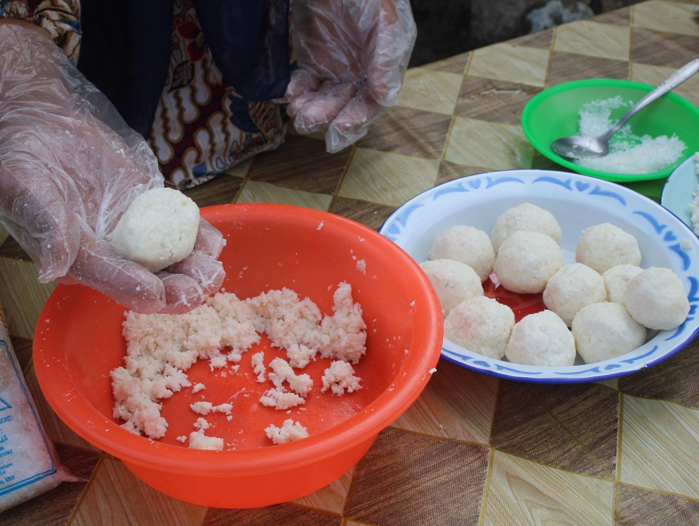 - Pipihkan adonan tadi lalu letakkan gula putih pada bagian tengahnya dan bulatkan. Begitu seterusnya sampai selesai;